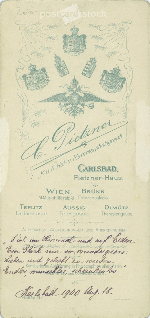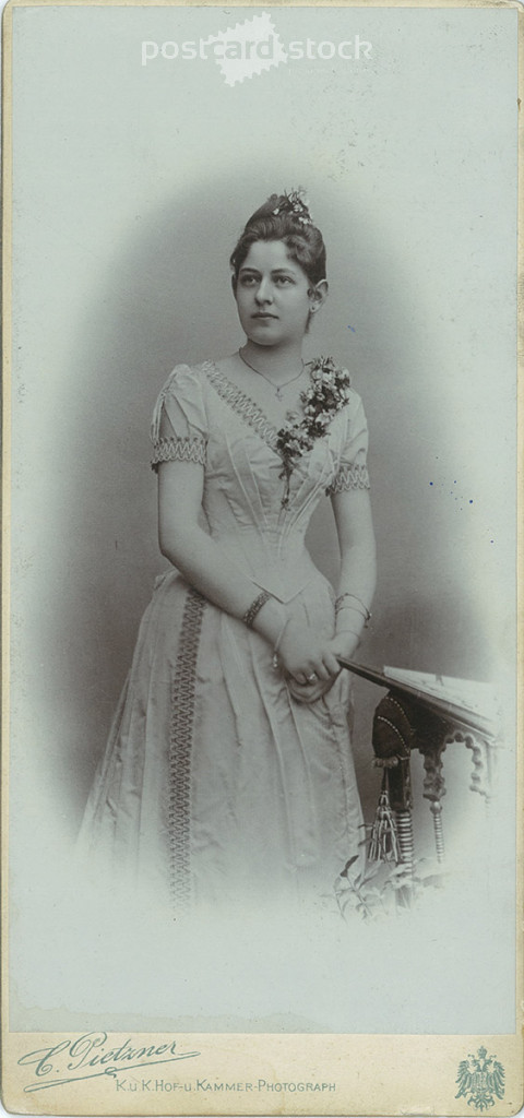 1900 - Studio portrait of an elegant young lady. The person in the picture is known. The photo was taken in the photo studio of C. Pitzner, Karlsbad. Old photo. Original Cabinet card / CDV photo / hardback photo. (2792848)