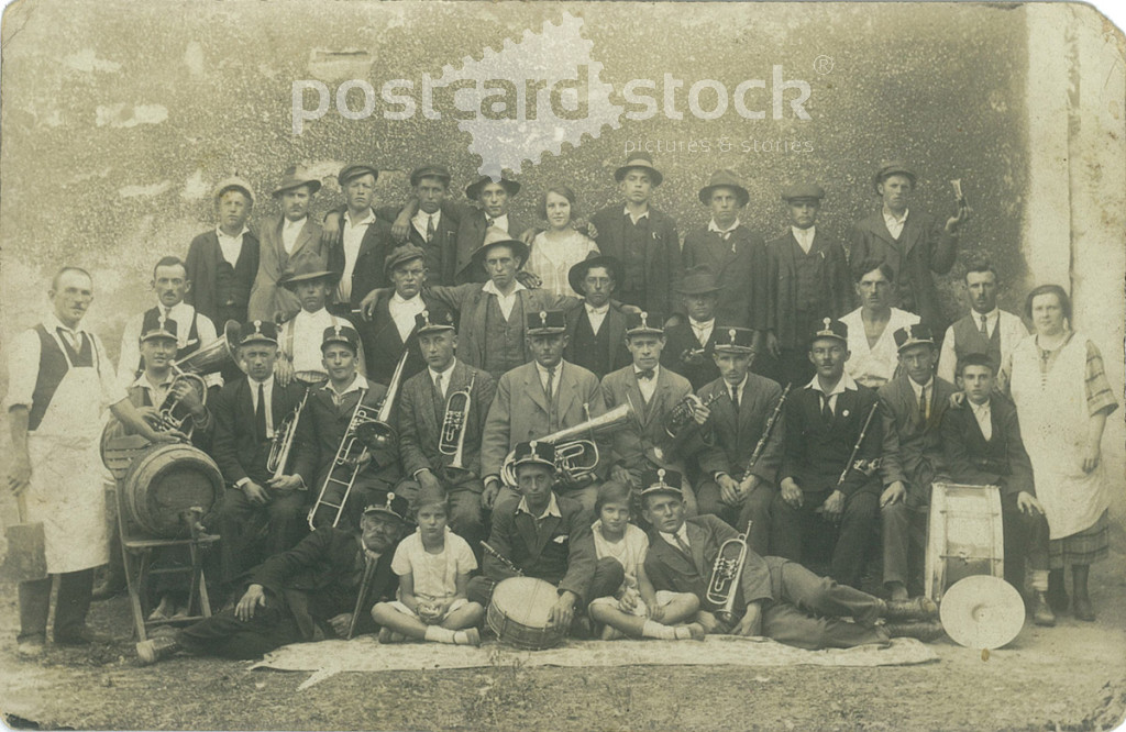 Railway(?) brass band with civilians. The people in the picture and the photographer are unknown. Original old photo. Black and white photo sheet, old postcard. (2792796)