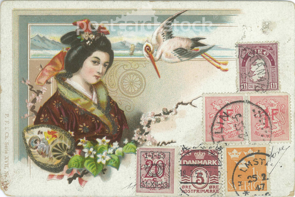 1902 - Japanese style children’s blessing greeting card. With 3-dimensional glitter powder decoration. Postcard. (2791448)