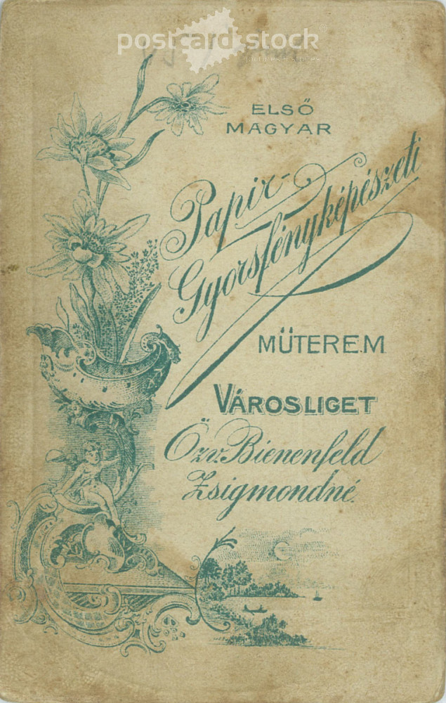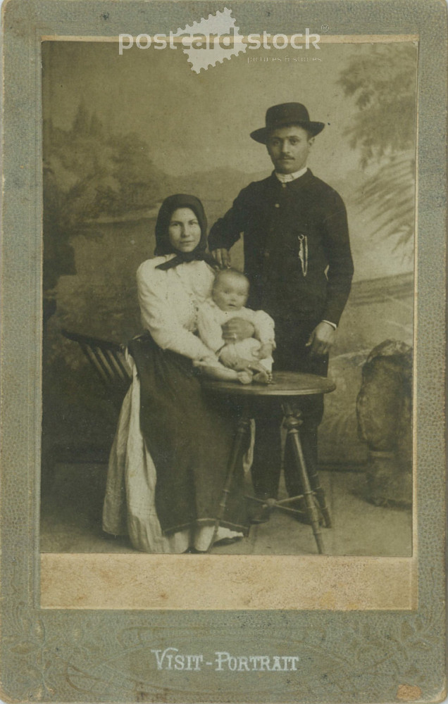 1910s. Studio portrait of a married couple with their child, full-length. Made in the Papír Speed Photography studio, Városloget, Budapest. Original Cabinet card / CDV photo / hardback photo. (2792269)
