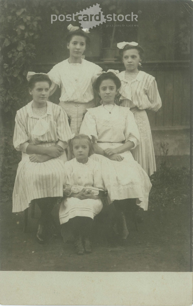 The picture may have been taken in Hungary in the 1910s. Sisters in white in front of the porch. Old postcard, photo sheet. (2792360)