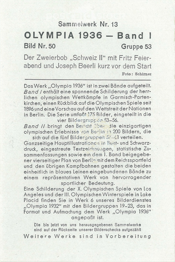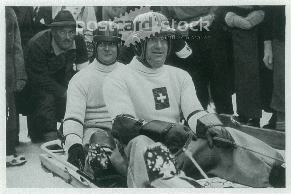 1936. Germany. The Swiss bobsleigh team at the Berlin Olympics. Black and white, reprint after an old photo, Olympic card. (2792523)