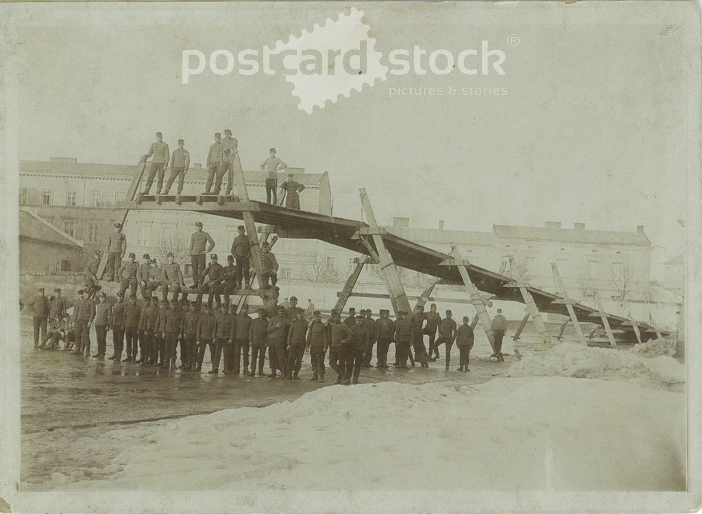 1910s. Service memorial. Bridge-building soldiers. The people in the picture and the photographer are unknown. Old photo. Black and white photo, original paper photo. (2793621)