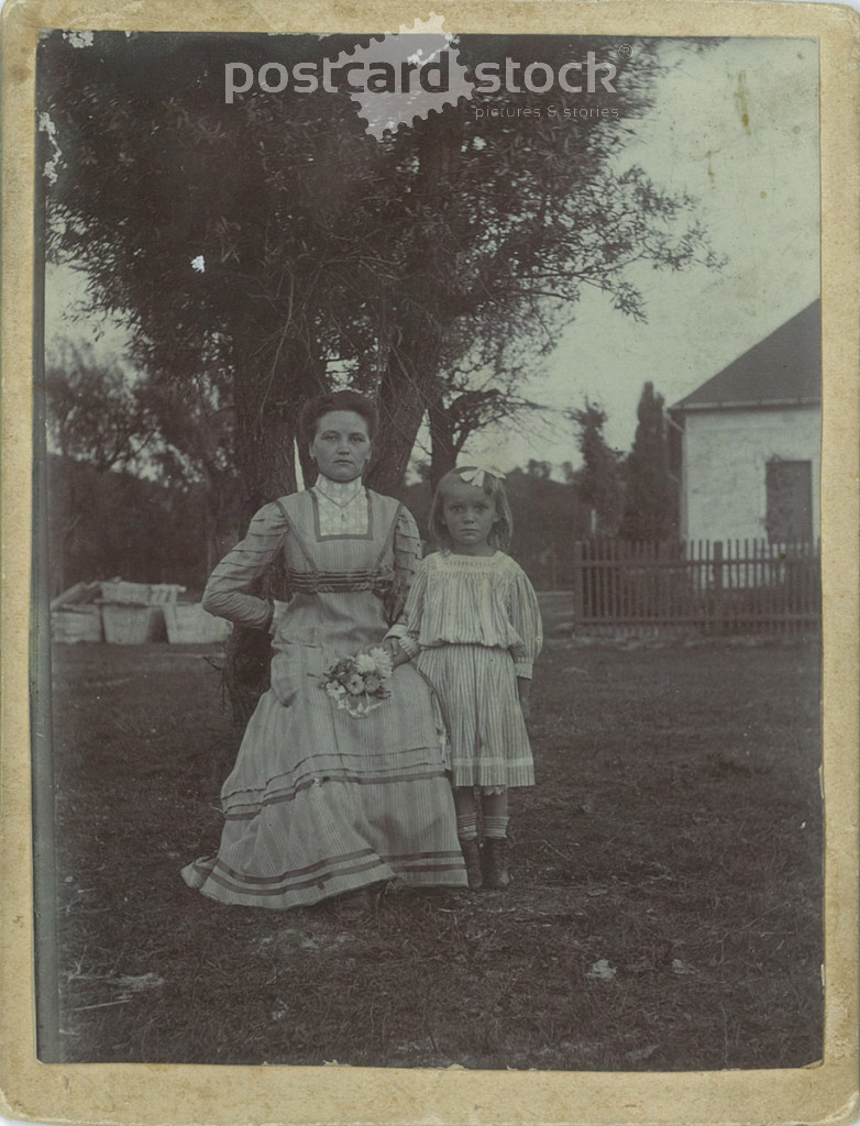 Circa 1910. Mother and daughter. The people in the picture and the photographer are unknown. Original old photo. Black and white, laminated photo, original paper image. (2793752)