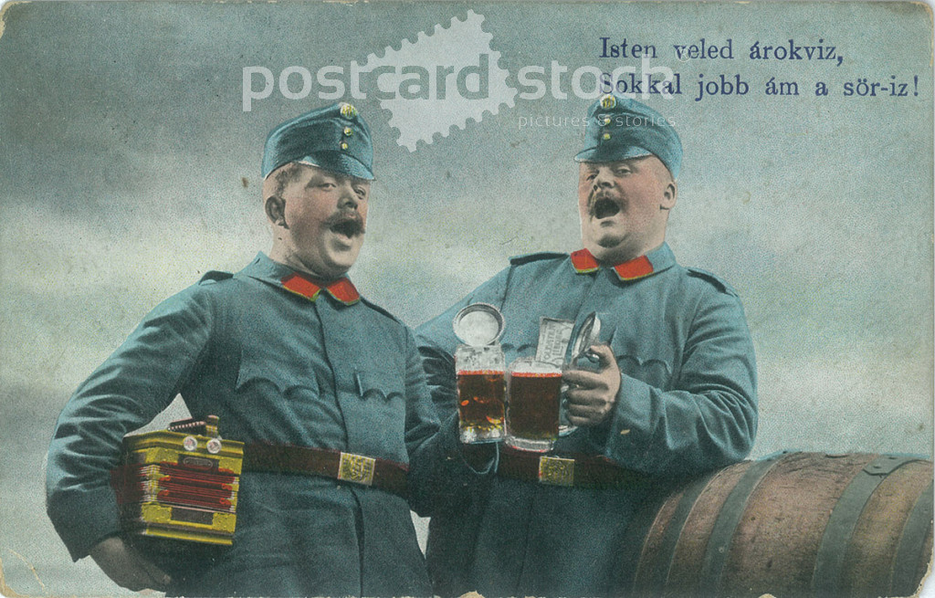 1916 - World War I Austro-Hungarian Monarchy soldiers. Drunk, singing soldiers, with humorous lyrics. Original paper image. Colored photo, old postcard. (2793838)