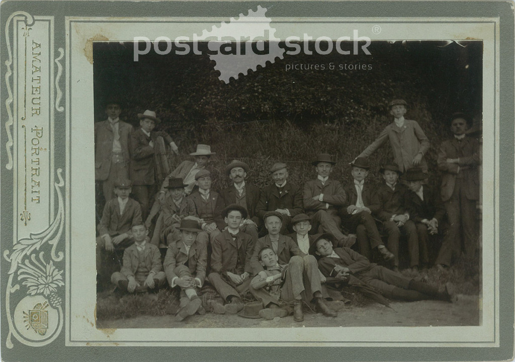 Group photo of young boys outdoors with their teachers, presumably taken in Transylvania. The people in the photo and the photographer are unknown. Original Cabinet card / CDV photo / hardback photo. (2793846)
