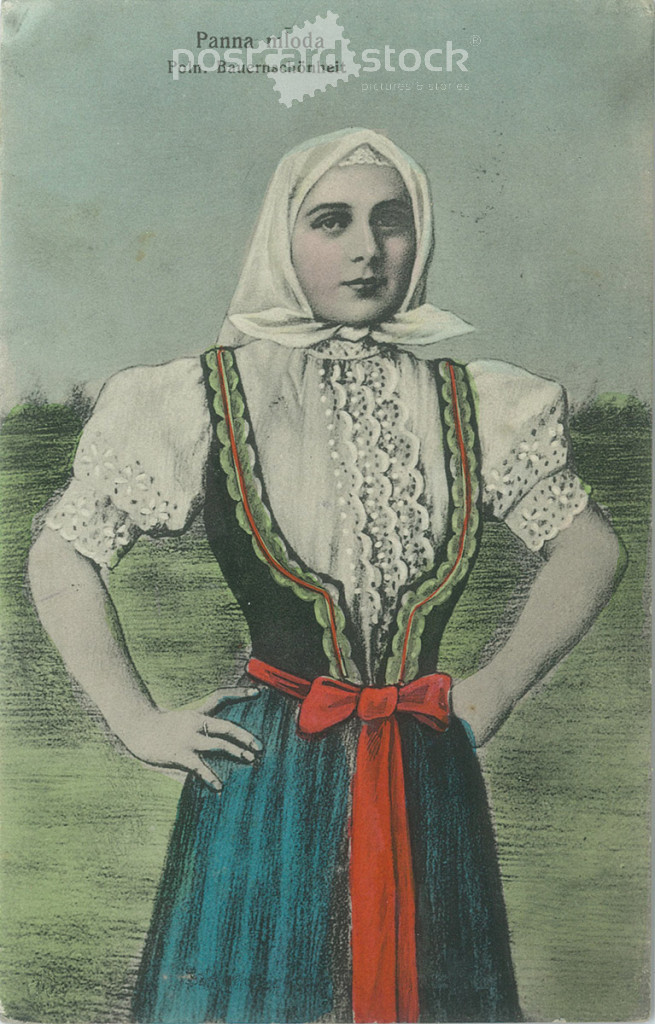 1915 - Polish girl in costume. Colorful unique graphic, old postcard. (2793847)