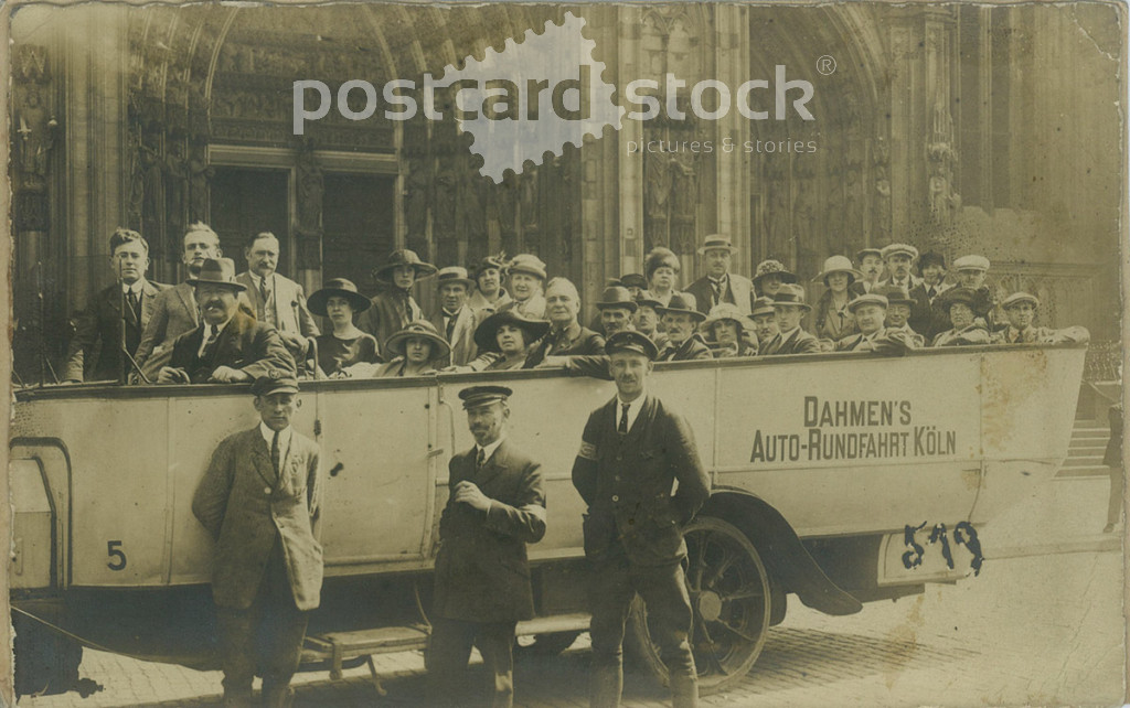 Sightseeing bus in front of Cologne Cathedral. The people in the picture and the photographer are unknown. Original old photo. Black and white, laminated photo, original paper photo. (2793851)