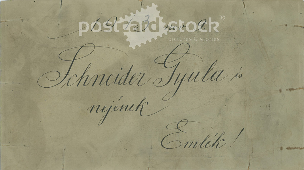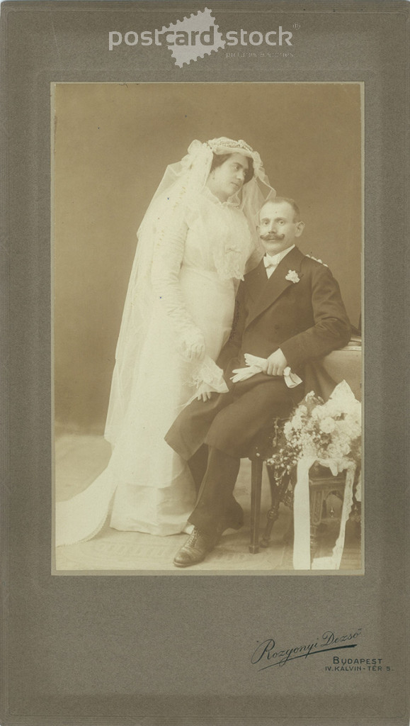 1913 - Studio photo of Gyula Schneider and his wife. The photo was taken in Dezső Rozgonyi’s photo studio in Budapest. Original old photo. Black and white, laminated photo, original paper image. (2793855)
