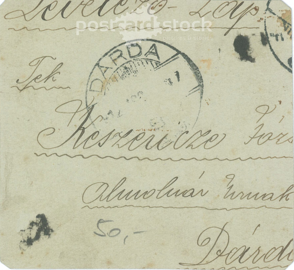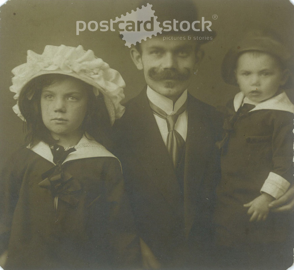 1907 - Dárda. Father with his children. Original paper image. Black and white old photo, old postcard detail. (2793857)
