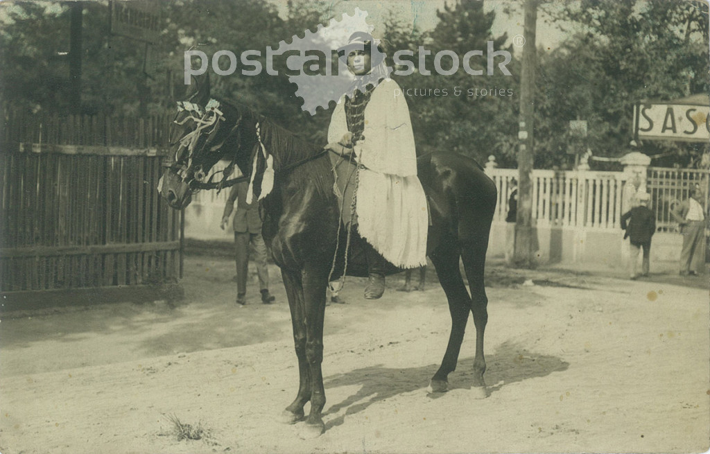 Young man on horseback. Original paper image. Black and white photo, old postcard. (2793858)