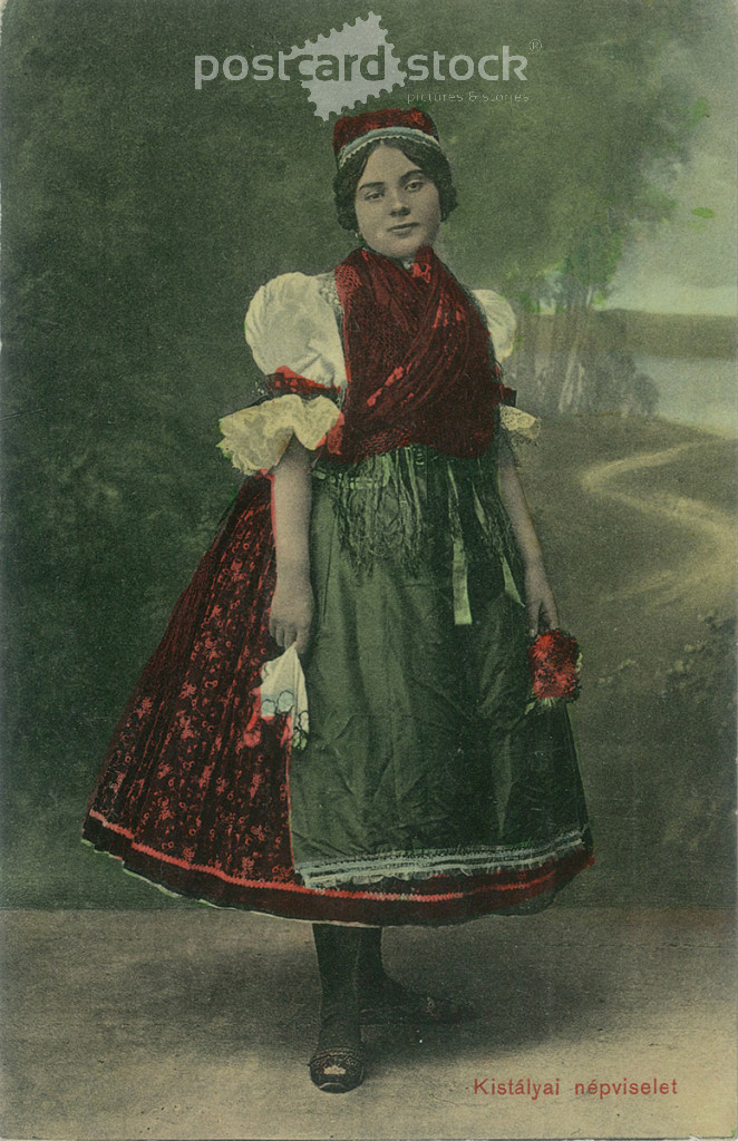 Kistálya folk costume. The person in the picture and the photographer are unknown. Colored photo. Old postcard. (2793863)