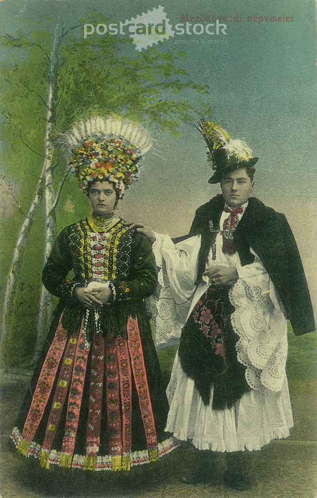Mezőkövesd folk costume. The people in the picture and the photographer are unknown. Colored photo. Old postcard. (2793864)