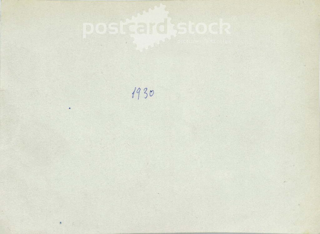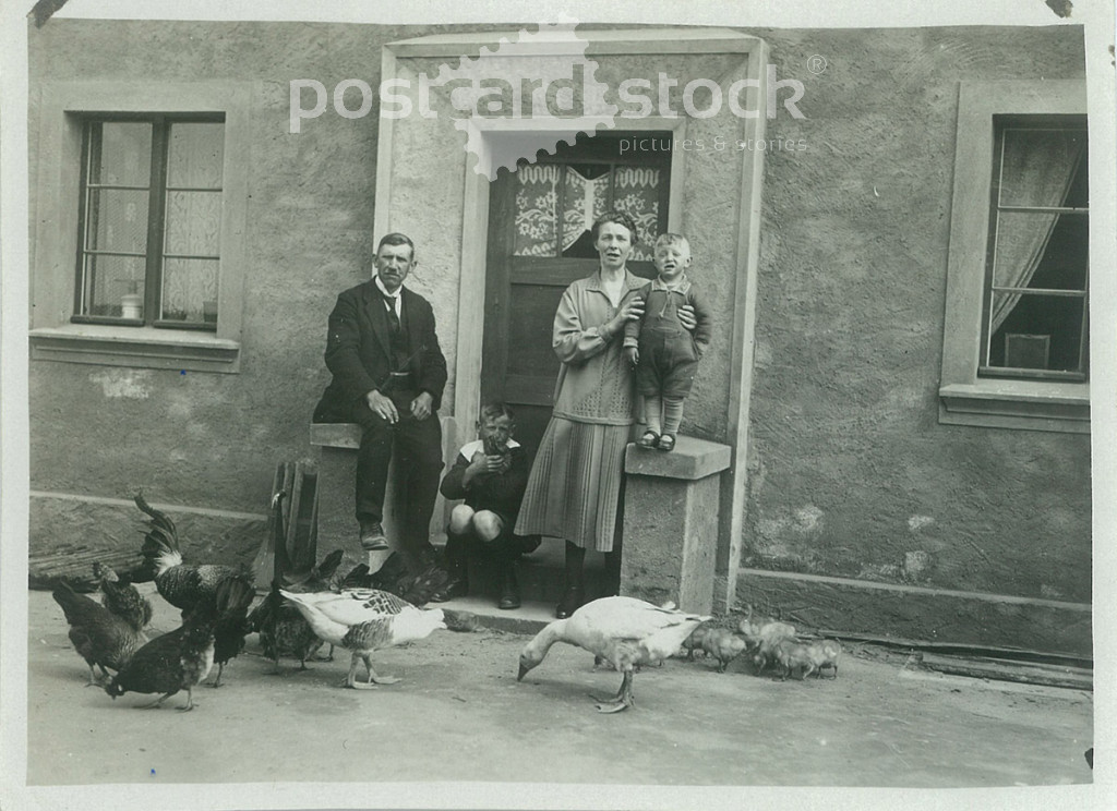 1930 - Family group photo at the entrance, with pets. The people in the photo and the photographer are unknown. Original old photo. Black and white photo, original paper photo. (2793873)