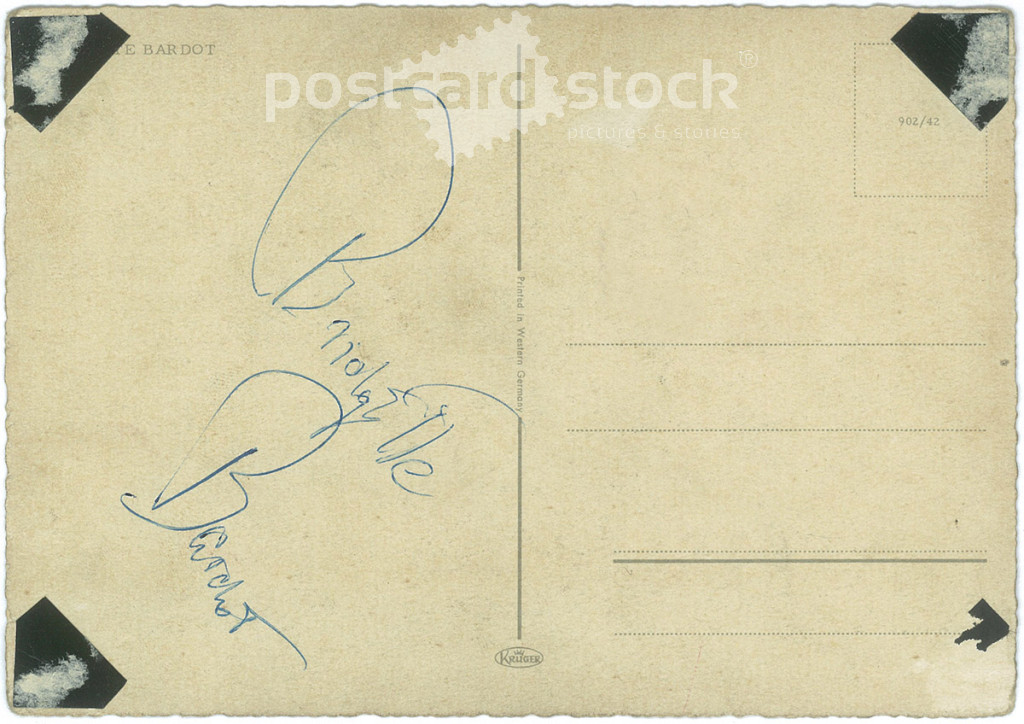 11955 - Brigitte Bardot French actress, singer. German postcard by Krüger. Photo: Cornel Lucas, Advertising image for the film Doctor at Sea. Original paper image. Old photo. Colored photo, old postcard. (2793875)