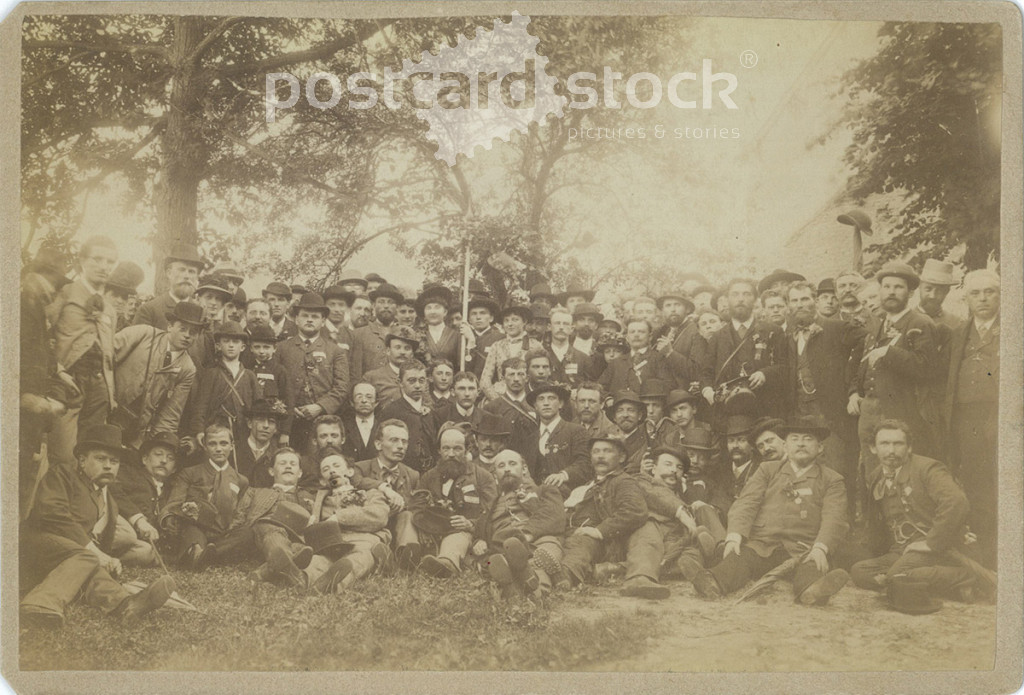 Group photo, during a festive event outdoors. The identity of the people in the photo and the photographer are unknown. Old photo. Original Cabinet card / CDV photo / hardback photo. (2793898)